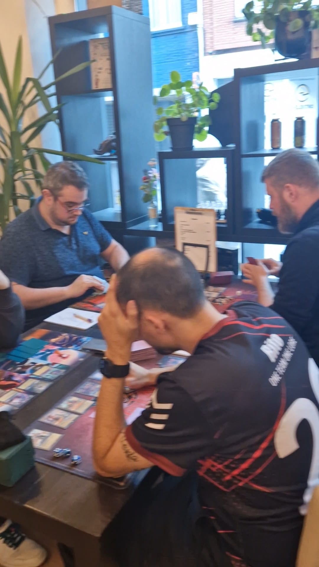 De top vult inderdaad een gelijkspel in en de rest van het toernooi gaat verder. Ook deze ronde worden er weer spullen uitgedeeld. Ik roep tafelnummers en Seb brengt de convention playmats.